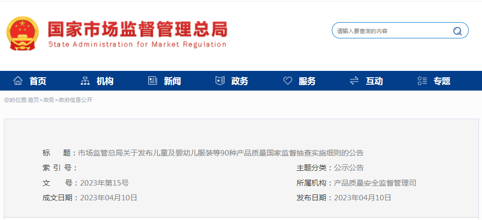 2023年4月10日,國家市場監(jiān)管總局發(fā)布了兒童及嬰幼兒服裝等90種產(chǎn)品質(zhì)量國家監(jiān)督抽查實施細則的公告...